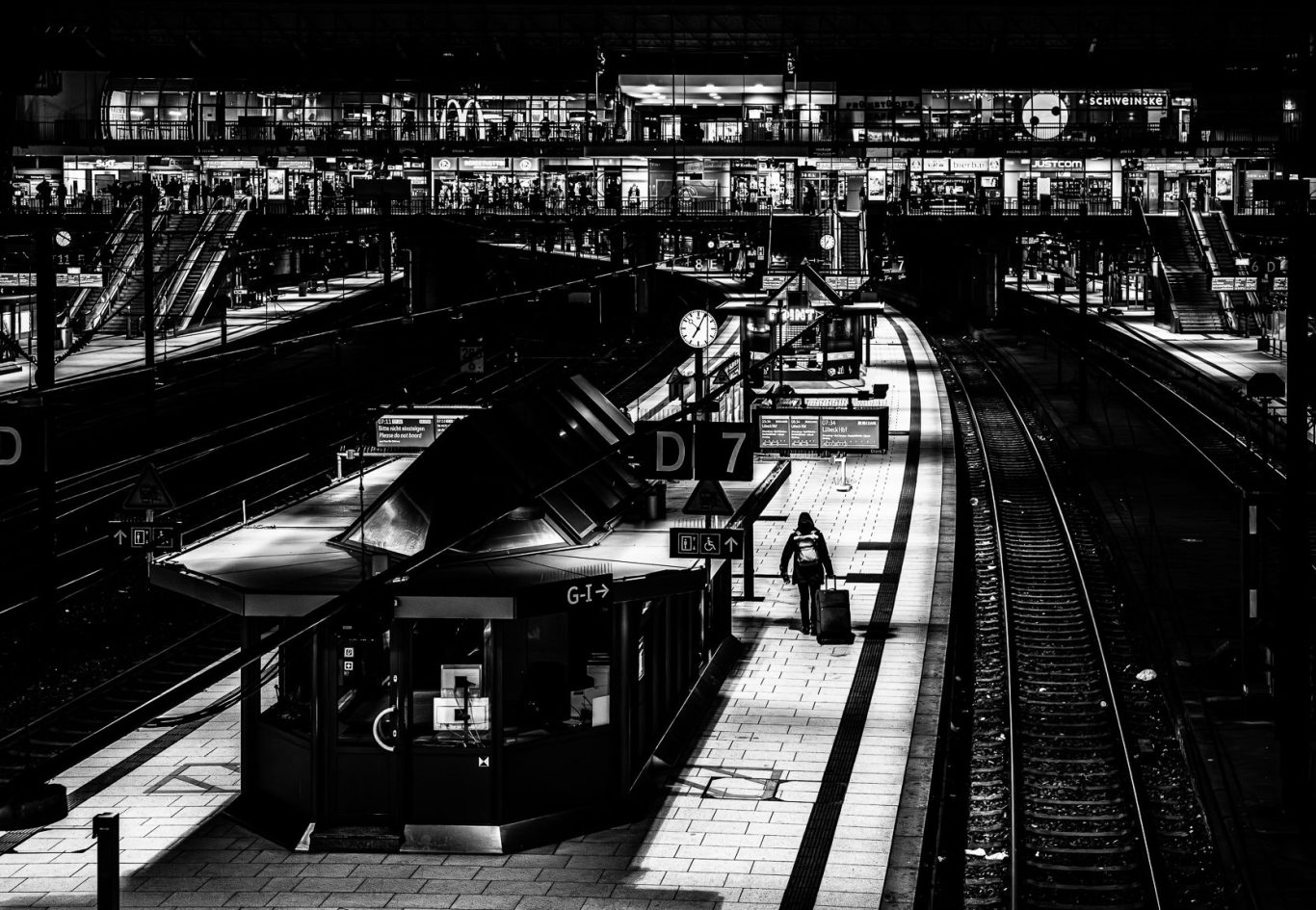 Solitary Transit isolates the individual within infrastructures built for collective movement. Platforms, corridors, and passageways become spaces of suspension, where figures linger without interaction, enclosed by geometry and direction.